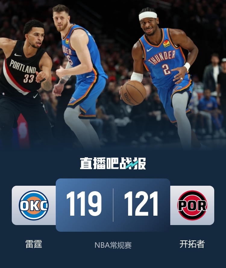 开拓者送残阵雷霆赛季首败 阿夫迪亚26+10+9 亚历山大35+9